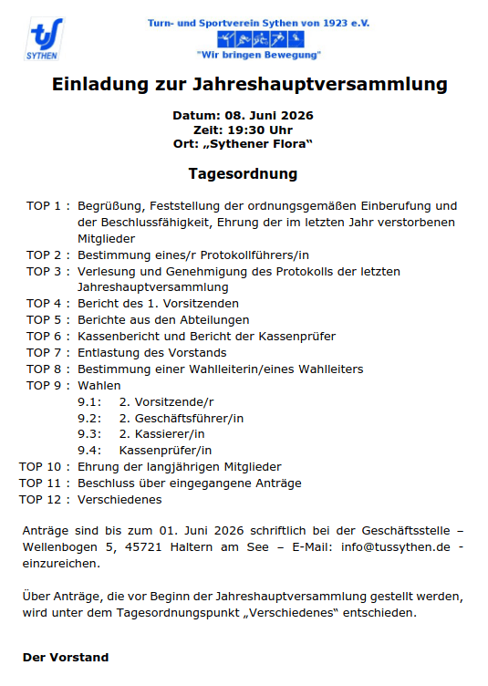 Einladung zur Jahreshauptversammlung am 8.Juni 2026 Veröffentlicht am 29. April 202630. April 2026 von Redaktion TuS Sythen Einladung-zur-JHV_2026.pdf Veröffentlicht in Breitensport, Leichtathletik, Tennis, Tischtennis, TuS Sythen aktuell.